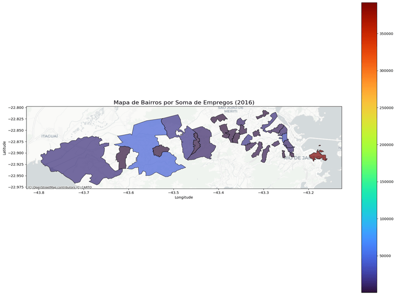 Resumo: O código carrega dados de empregos (2016) e geográficos de bairros, combina-os, e cria um mapa coroplético que visualiza a soma de empregos por bairro com uma escala de cores e fundo de mapa.