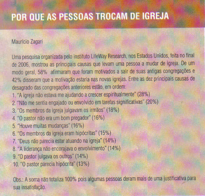 Publico aqui uma pesquisa feita nos EUA, em 2006, pela LifeWay cujo resultado pode ser similar ao caso brasileiro: