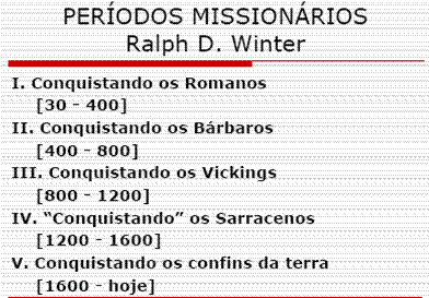 Ralph Winter (1925 – 2009) foi professor de missões no Seminário Fuller e formulou uma nova perspectiva da história dos movimentos missionários. A única sugestão de melhoria, se possível, seria trocar a expressão “conquistando” os sarracenos por conquistando as índias devido à cataquese dos ameríndios mesmo com os métodos deploráveis. Mas poder de Deus também faltou na conquista de outros povos em séculos anteriores.
