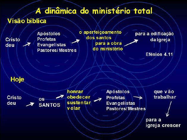 O fluxo de ação ministerial ideal está expresso no relato histórico do livro de Atos dos Apóstolos. O apóstolo Paulo definiu seu propósito em Efésios 4:11-13.