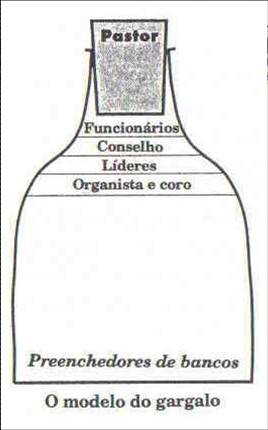 Charles Van Engen, meu professor da FTSA e coordenador do PRODOLA, representa a dificuldade enfrentada pelos pastores para prover agilidade nas decisões e coordenar as atividades da igreja conforme ela cresce. Ele a chama de modelo do gargalo.
