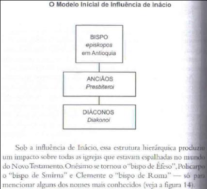 Para Inácio, o Bispo tomara o lugar de Deus enquanto que os presbíteros tomaram o lugar dos doze Apóstolos. Apenas o Bispo poderia celebrar a Santa Ceia do Senhor, dirigir os batismos, dar conselhos, disciplinar os membros da igreja, aprovar os matrimônios e pregar sermões.