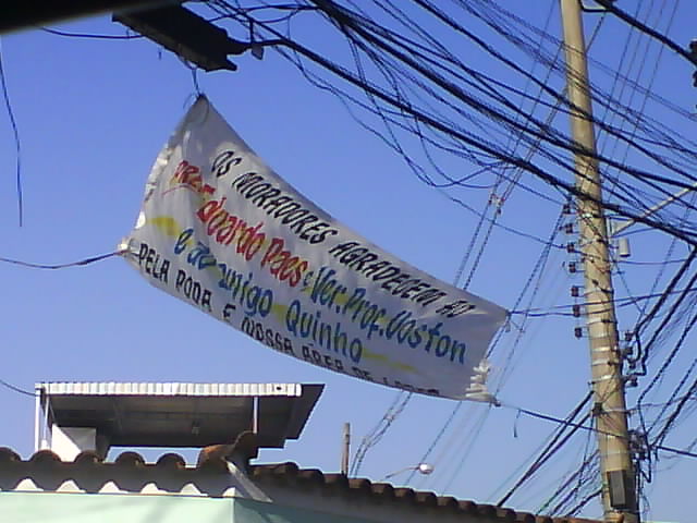 Na mesma rua General Cláudio, 2 faixas são colocadas em postes e protegidas por ‘seguranças’, promovendo campanha eleitoral por motivos ridículos, como serviço de poda de árvores e reserva de área de lazer. É a maneira brasileira de fazer política. E o povo passa, percebe, aceita e recebe …..