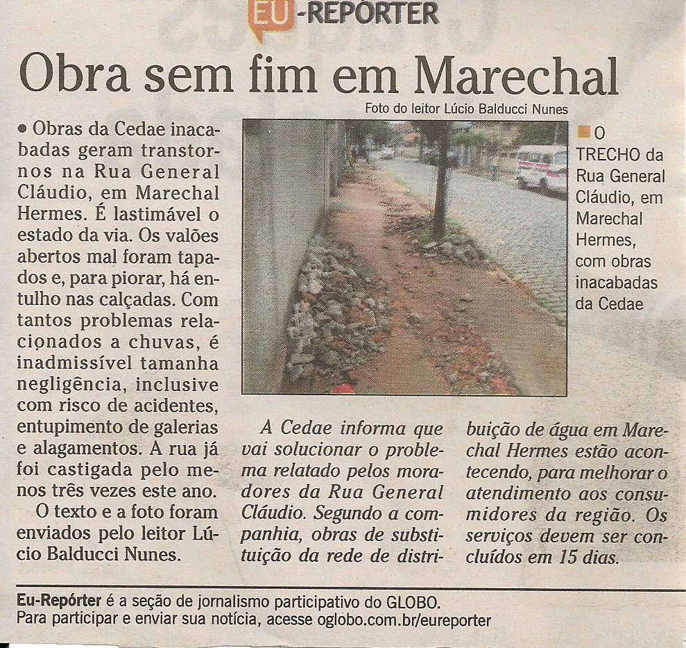 Um inadvertido leitor, quando lê a notícia abaixo, pode pensar que a CEDAE é o grande responsável pelos problemas desta comunidade. Mas não é verdade. A prefeitura precisa concluir importantes obras de drenagem pluvial. Mas está seduzida em ações de fantasia.