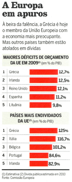 De acordo com as regras da Zona do Euro, a dívida de um país não pode ultrapassar 60% do PIB. A situação da Grécia é a pior com sua dívida maior que 100% e crescendo. Cerca de 1/4 de todos os trabalhadores são funcionários do governo.