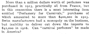 O Periódico THE JOURNAL OF INDUSTRIAL AND ENGINEERING CHEMISTRY, de setembro de 1918, avaliou a importação de produtos químicos da América do Sul, especialmente o Brasil. Em 1913 foram gastos U$ 400 mil de “lança-perfumes”.