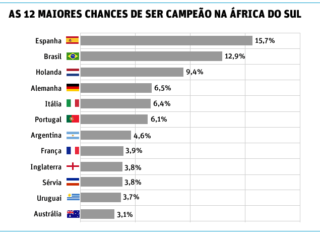 Já os especialistas em investimentos do banco Goldman Sachs também dão o vice-campeonato aos espanhóis. Mas, para eles, o vencedor será o time de Dunga.