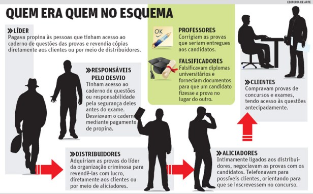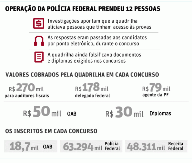 BRASÍLIA e SÃO PAULO. A Polícia Federal prendeu em 16 de junho, em São Paulo, 12 pessoas acusadas de fraudar concursos públicos para garantir acesso a altos cargos do funcionalismo federal. Os candidatos, segundo a PF, pagavam até US$ 150 mil (cerca de R$ 270 mil) pelo gabarito da prova, dependendo do cargo que iriam “disputar”. No Rio de Janeiro, as fraudes em concursos lideram as reclamações na Ouvidoria do Ministério Público que, parece não se mexer muito.