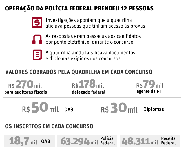 A PF aponta ainda que a quadrilha agia a, ao menos, 16 anos, tendo fraudado uma prova da Receita Federal, em 1994. O grupo teria tentado fraudar ainda concursos da Caixa Econômica Federal, da Aneel (Agência Nacional de Energia Elétrica), do INSS, da AGU (Advogado da União), da Santa Casa de Santos, de Defensor Público da União e da Faculdade de Medicina de Ouro Preto.