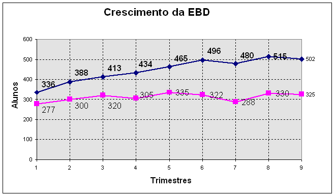 O gráfico abaixo indica a matrícula (azul) e a frequência (vermelho) de 2001 a 2005, por semestre. Convém acrescentar que a IBCA cresceu no período de 860 a 1140 membros: