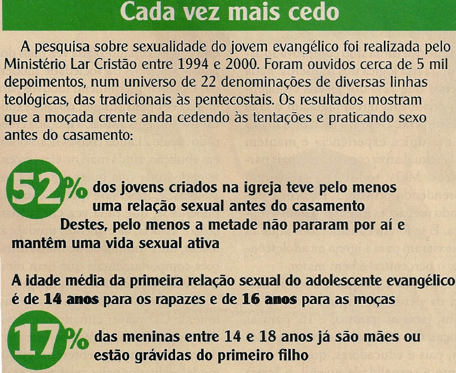 Acredito no resultado da pesquisa e acho pertinente levantar essa questão. Só não concordo com o comentário pois não vejo ligação entre lar desestruturado e desenvolvimento da sexualidade. O que seria lar desestruturado? pais divorciados? Acho que o desenvolvimento sexual precoce tem mais ligação com a banalização do sexo e influência dos meios de comunicação, que também atinge os jovens cristãos. A porcentagem apontada na pesquisa dos jovens que tiveram relação sexual antes do casamento é considerável e está em contradição ao comentário, visto que a maioria de jovens na igreja vieram de um lar cristão.
