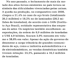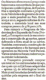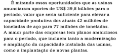 Cidade e igreja Ferro do Brasil, aço da China Data: 19/01/2011Autor: jairwpr 0 Comentários O preço do aço do tipo chapa dupla já havia aumentado 150% de 2003 a 2005, o que aumentou o custo de fabricação das plataformas P-51 e P52 da Petrobras. Aumentou o custo das obras do GASENE. Compartilhe isso: Clique para compartilhar no Facebook(abre em nova janela) Facebook Clique para compartilhar no X(abre em nova janela) 18+ Curtir Carregando...