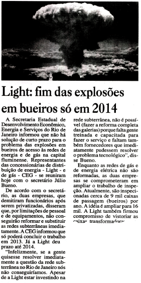 Ex-funcionária da Light e atual diretora da Central de Trabalhadores do Brasil, Sônia Latgê diz que, desde a privatização, há 15 anos, a Light cortou 8 mil funcionários, terceirizou atendimento, supervalorizou a área comercial e subvalorizou a manutenção. “Algumas caixas subterrâneas são centenárias. Da Zona Sul ao Centro, há pontos de alto risco. Essas caixas podem sofrer infiltração e aquecer por sobrecarga”, explica. O problema foi apontado em relatório da Aneel após vistoria em novembro de 2009.