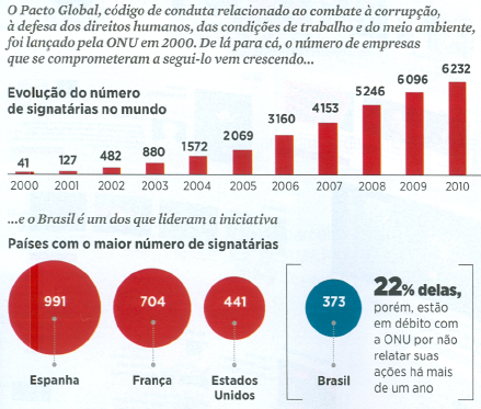 O Pacto Global foi lançado em 2000 pelo então presidente da ONU, Kofi Annan. Seu objetivo era estreitar a relação da organização com o setor privado e motivá-lo a se envolver com as principais causas que ela defende. No final de 2010,6 232 empresas, de cerca de 130 países, faziam parte do pacto. O Brasil tem a quarta maior rede do mundo, com 373 signatárias. Tais números grandiosos, porém, representavam pouco em matéria de ação. A comunicação das práticas era deficiente. E a única reprimenda que as empresas relapsas em relação ao compromisso com o Pacto Global sofriam era a classificação como “inativas”.