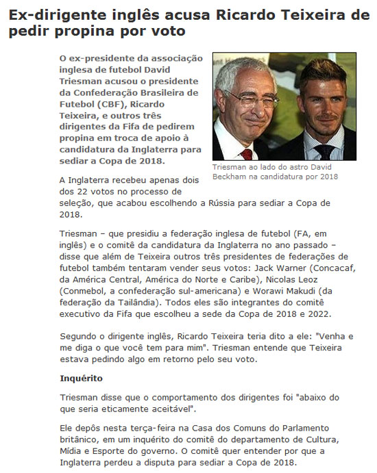 TWITTER: @Zeluizbariani _ Enquanto o imperador da CBF se vê às voltas com mais uma denúncia de corrupção, desta vez por um membro da Câmara dos Lords da Inglaterra e membro do Comitê que tentou, sem sucesso, a escolha do seu país como sede do mundial de seleções de 2018, seus aliados ocupam o espaço dos noticiários com notícias nem sempre verdadeiras, mas sempre preocupantes para os pobres torcedores brasileiros.