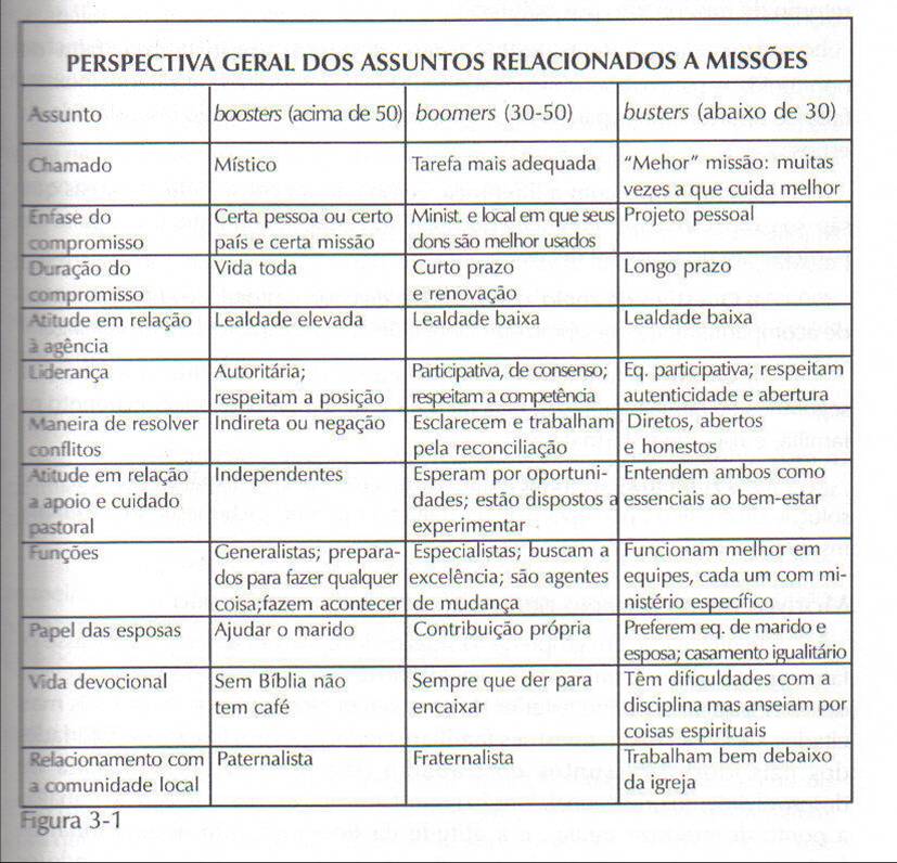 O quadro abaixo demonstra as diferenças das gerações em relação às ações missionárias: