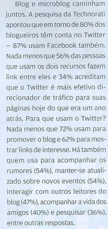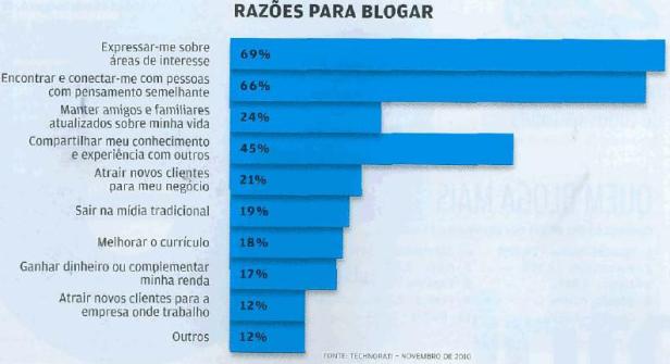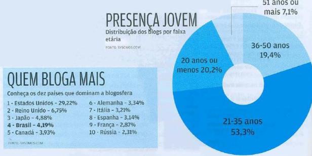 Segundo o indexador de blogs BlogPulse, da Nielsen, no início de maio havia mais de 16 milhões de blogs no mundo. Publicado em junho de 2010, o levantamento da sysomos.com dá pistas também sobre o perfil dos blogueiros. Segundo a empresa, a grande maioria (53.3%) tem entre 21 e 35 anos, ou seja, são pessoas que cresceram no mundo já tomado pela revolução dos blogs. Em seguida, vêm os blogueiros com 20 anos ou menos (20.2%).