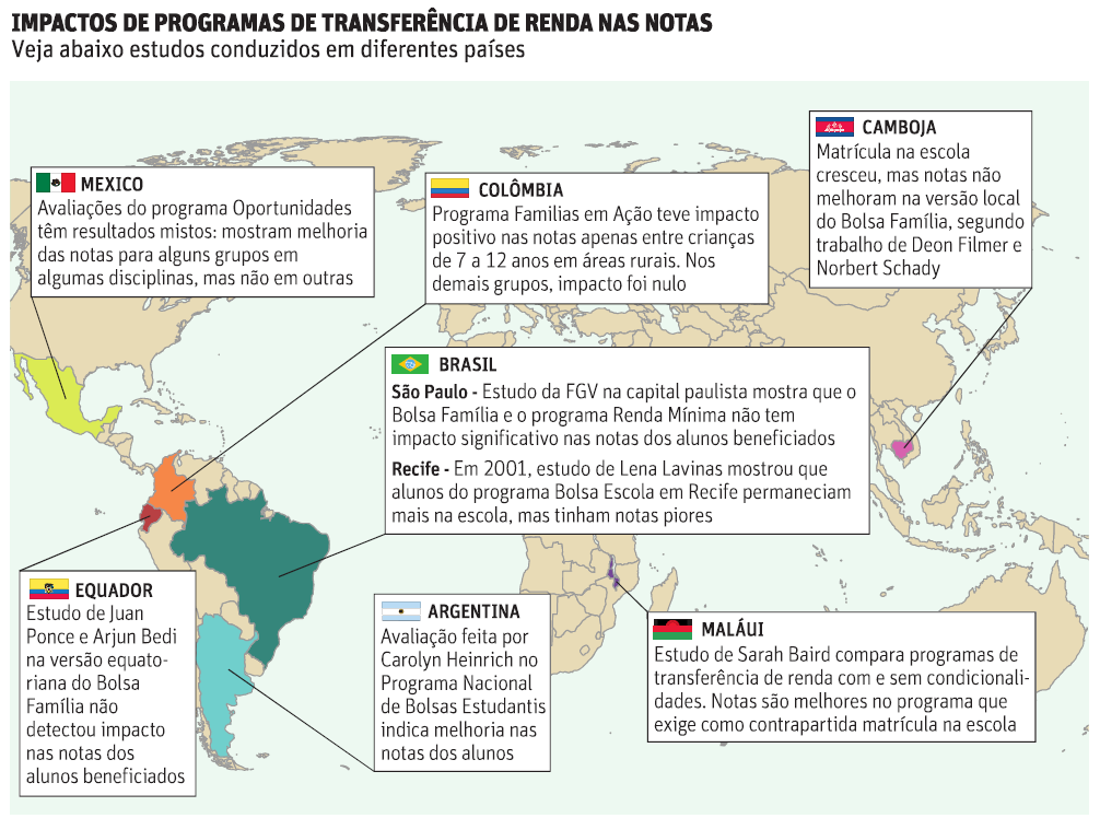 Estudo da FGV mostra que Bolsa Família não melhora desempenho escolar. O estudo foi feito nas provas escolares em São Paulo e concorda com o estudo feito por Fernando Reimers, da Universidade de Harvard, que apontou em relatório para a UNESCO que programas de transferência de renda geram pressão para a frequência escolar mas não resolve a baixa qualidade de ensino e aprendizado.