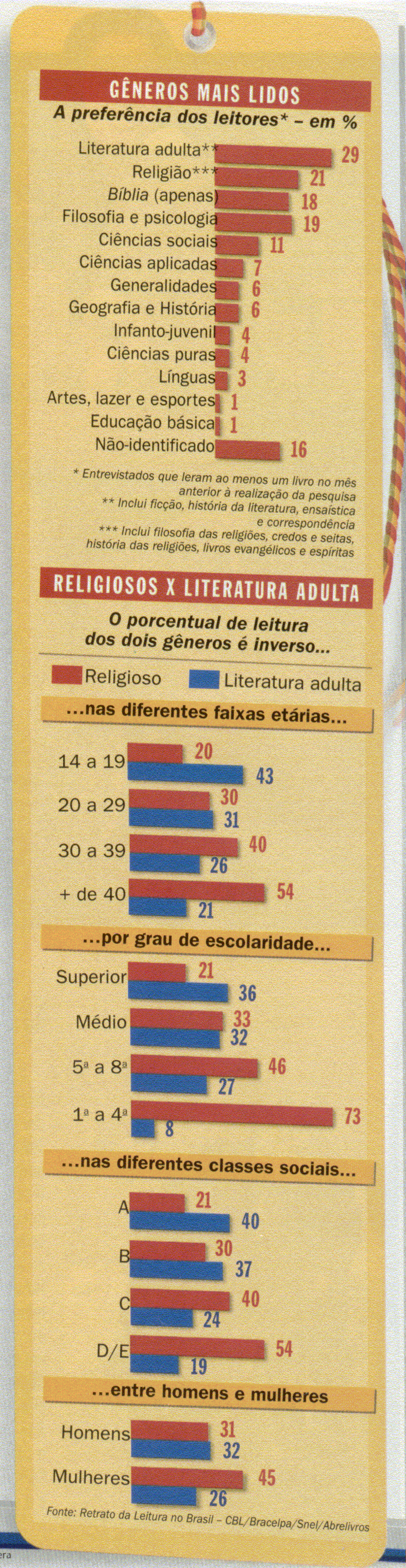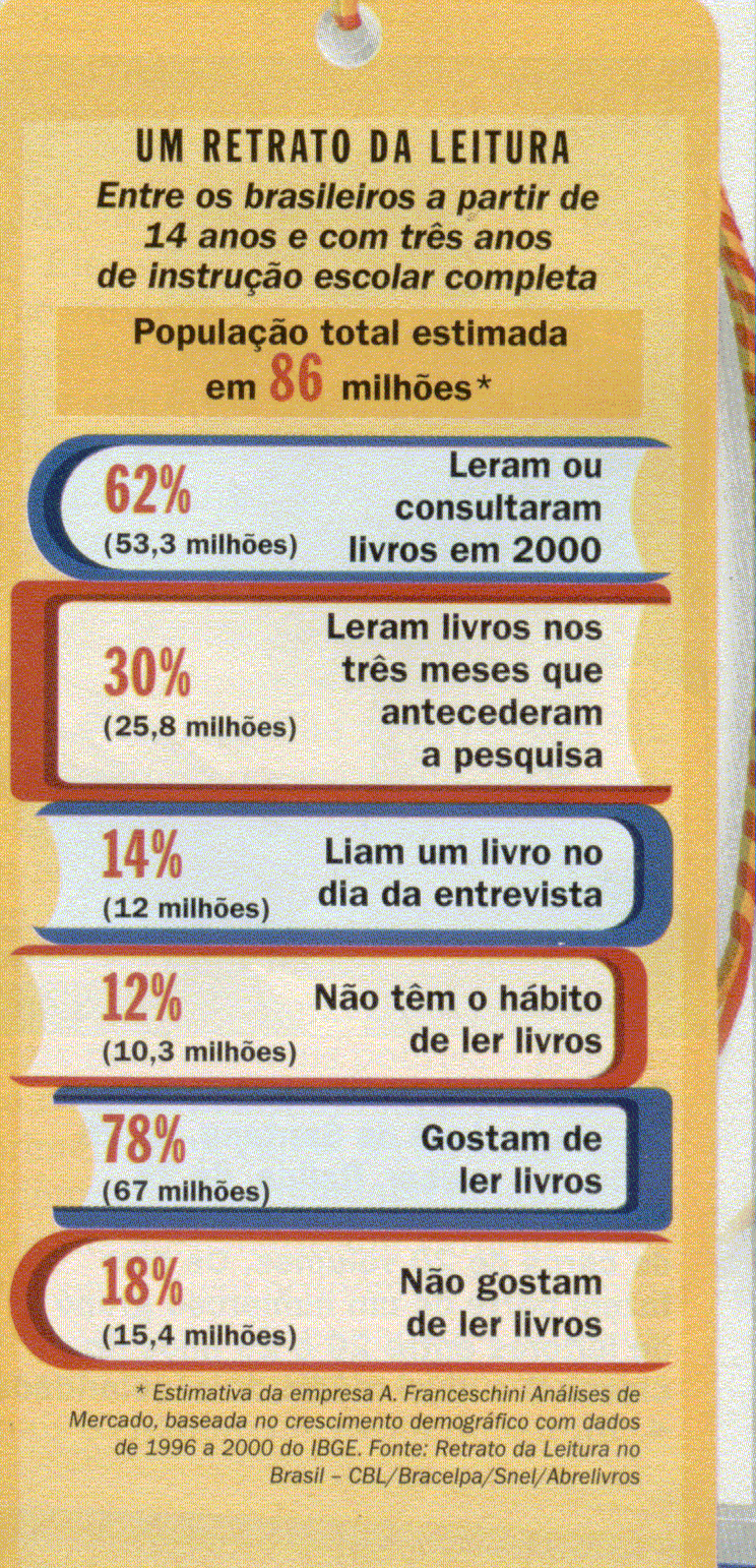 Segundo o Ibope, a média nacional entre a população acima de 5 anos ficou em 4,7 livros por ano. A maior parte disso, no entanto, está ligada à escola e à distribuição de obras didáticos pelo governo. Dos 4,7 livros lidos anualmente, 3,4 dizem respeito aos exemplares escolares e apenas 1,3 à leitura fora do colégio.