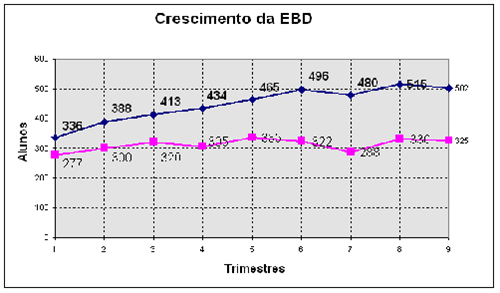 O gráfico abaixo indica a matrícula (azul) e a freqüência (vermelho) de2001 a2005, por semestre. Convém acrescentar que a IBCA cresceu no período de 860 a1140 membros: