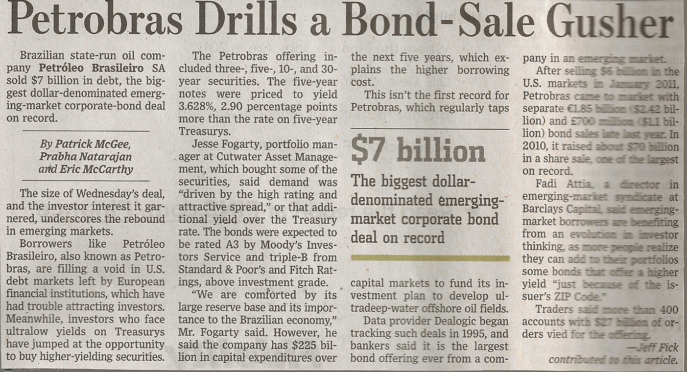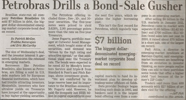 A Petrobras concluiu em 06/02, através da sua subsidiária integral Petrobras International Finance Company (“PifCo”), a oferta de títulos no mercado de capitais internacional (Global Notes), o que resultou no recebimento de recursos no montante de US$ 7 bilhões. A operação, precificada no dia 01 de fevereiro de 2012, foi constituída pela emissão de títulos com vencimento em 2015 e 2017 e pela reabertura dos títulos com vencimento em 2021 e 2041.