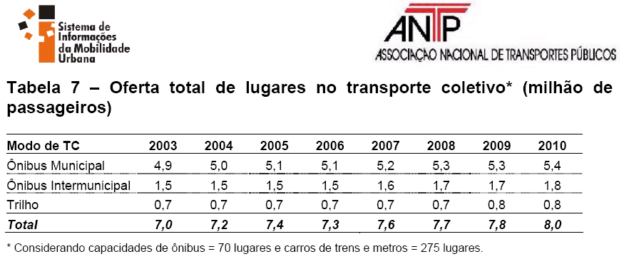 A tabela abaixo demonstra como a evolução do transporte por ônibus continuou crescendo nos municípios ao longo dos últimos anos. O transporte ferroviário recebeu pouco investimento, deixando-o quase estagnado.
