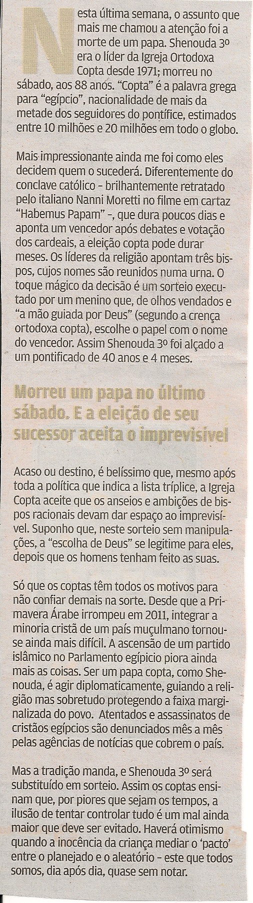 A escolha do novo patriarca poderá durar vários meses. Segundo um regulamento de 1957, ele deve ser um copta egípcio, solteiro e com menos de 40 anos e deve também ter passado pelos menos 15 anos num mosteiro. Um conselho de mil e 500 pessoas participará na seleção do futuro patriarca.