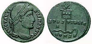 Uma das moedas cunhadas a mando de Constantino foi a SPES PVBLIC que proclamava explicitamente a nova fé de Constantino. Ele e Eusebius, seu historiador, se referiam ao dragão e à serpente com relação ao Arianismo. Constantino utilizou o simbolismo do dragão quando se referiu a Licinius, general inimigo. É possível que o ritualismo cristão admitiu a imagem do rei cristão destruindo o dragão desde então.