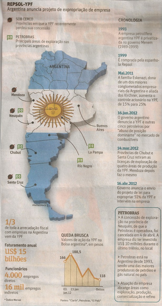 O governo de Cristina Kirchner decidiu expropriar parte da petroleira YPF no país, filial da espanhola Repsol 51% das ações da companhia passarão ao controle do governo federal, enquanto os outros 49% serão distribuídos entre as províncias.