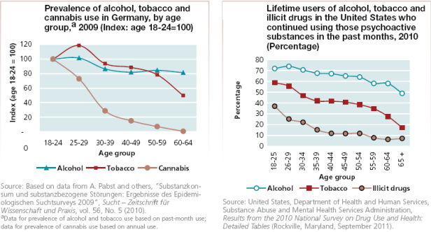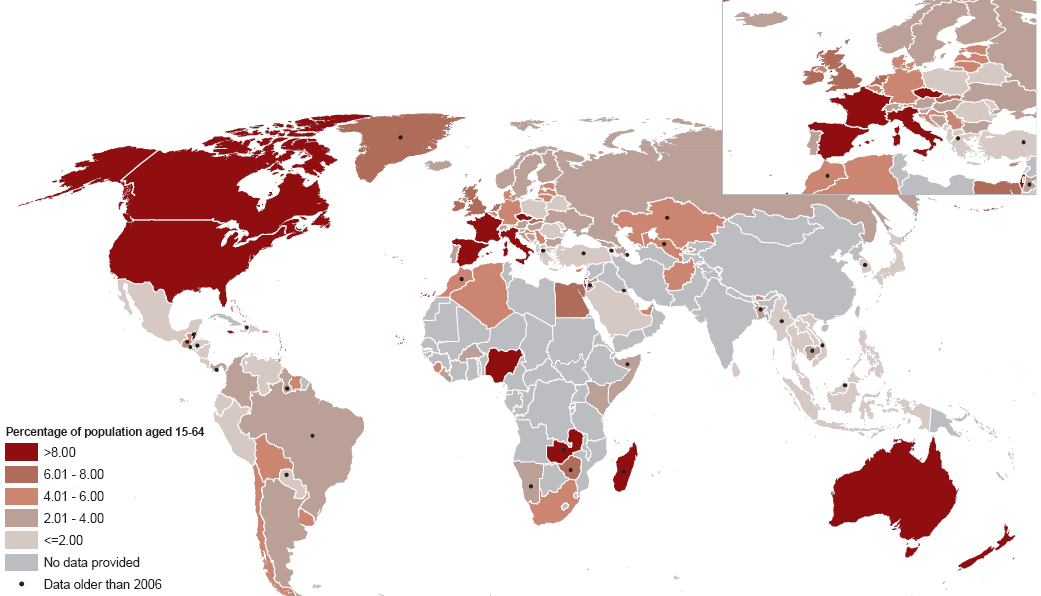 Cannabis is the world’s most widely used illicit substance: there are between 119 million and 224 million cannabis users worldwide, and consumption is stable. Global estimates show that current tobacco use (25 per cent of the population aged 15 and above) is 10 times more widespread than current illegal drug use. Alcohol, which is legal in most countries, has an annual prevalence rate of 42 per cent, which is eight times larger than that of illicit drug use. Heavy episodic weekly drinking is eight times more prevalent than problem drug use.