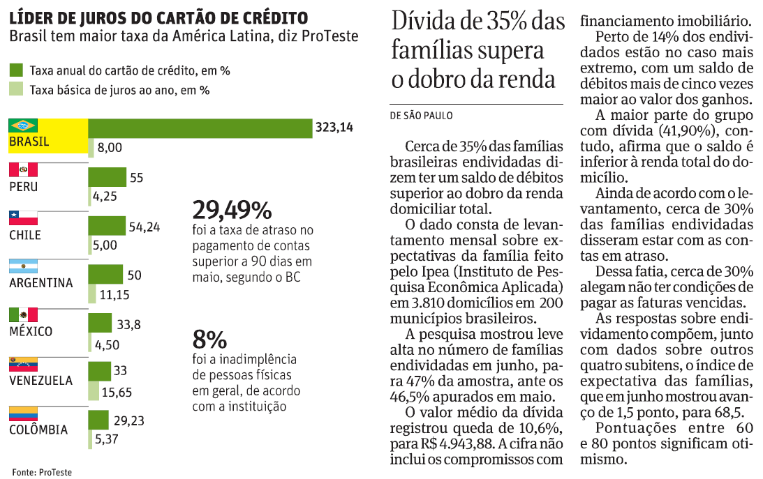 O número de famílias endividadas no país cresceu 6,39% entre 2010 e 2011, de acordo com pesquisa feita pela Federação do Comércio de Bens, Serviços e Turismo do Estado de São Paulo (Fecomercio-SP). Os dados mostram que 62,5% das famílias têm algum tipo de dívida, o que representa 525 mil famílias nas capitais. A capital com aumento maior da quantidade de famílias endividadas foi Florianópolis, que tem 119.271 (88,8%) de suas 134.271 famílias nessa situação. Em 2010 eram 58,6%. O volume das dívidas aumentou 11,57%, com as famílias devendo em 2010 R$ 145,1 bilhões e em 2011, R$ 161,9 bilhões. Por mês essa dívida fica em R$ 13,5 bilhões. Em 2010 era de R$ 12,1 bilhões.