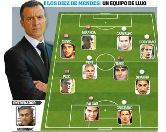 Jorge Mendes é empresário de cinco jogadores do Real Madrid, além do próprio treinador português. Cristiano Ronaldo, Fábio Coentrão, Ricardo Carvalho, Pepe e Ángel Di María são agenciados pelo empresário.