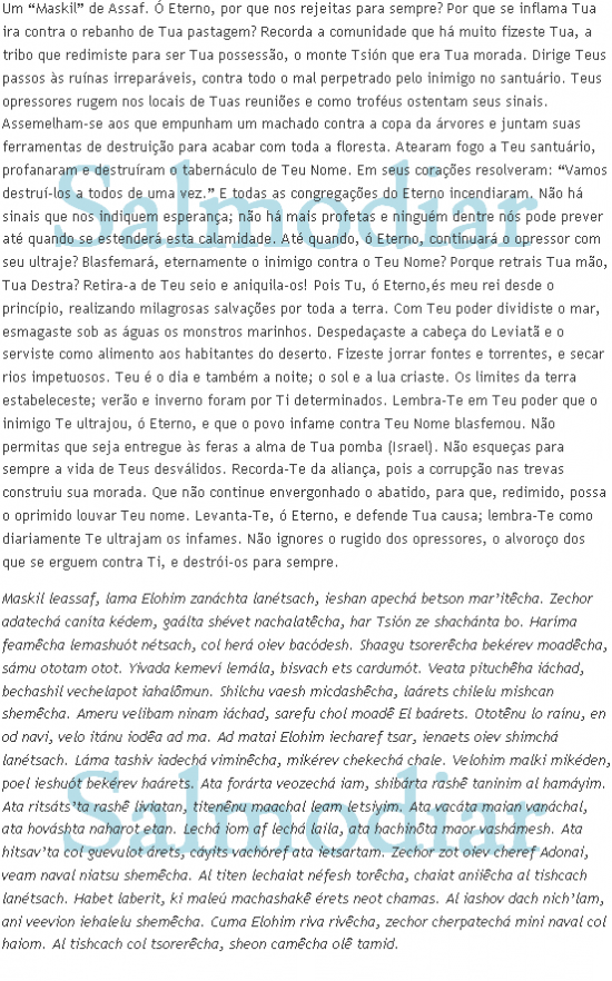 Spurgeon, no seu cometário sobre os Salmos, comenta que o poeta pleiteia as tristezas da nação e a malvadez feita às assembléias do Senhor; depois insiste que antigas mostras do poder divino são razão de livramentos no presente (Sl 74.12-23). Se é um salmo profético, visando ser usado em dificuldades previstas, ou se foi escrito por Asafe após a invasão por Senaqueribe ou durante as guerras dos Macabeus, é muito difícil determinar, mas não vemos nenhuma dificuldade com a primeira suposição.