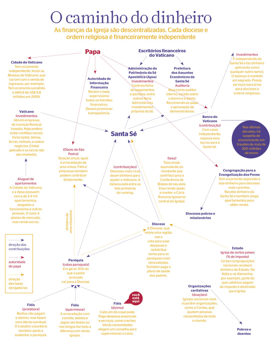 Problemas ligados à administração financeira não são exclusivos dos católicos, claro (vide a condenação dos líderes da evangélica Renascer), mas o mesmo sigilo de Roma se repete pelo mundo. Na Alemanha, o cientista político Carsten Frerk tardou anos para apurar a arrecadação das dioceses católicas e protestantes. Concluiu em 2009 que as paróquias alemãs tinham 200 bilhões de euros em patrimônio. E receberam 9,3 bilhões em taxas. “Com o chamado imposto da Igreja, cerca de 9% do que os católicos declarados pagam de imposto de renda ao Estado vai para a Igreja”, afirma, relatando ter sido “muito difícil” concluir o levantamento. No Brasil, a CNBB tampouco forneceu detalhes de suas finanças.