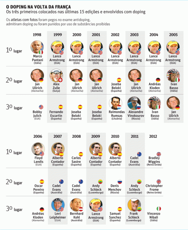 Imbatível durante sete anos na Volta da França, o americano Lance Armstrong, que chegou a ser considerado uma lenda do ciclismo, teve sua imagem manchada para sempre por ter montado um sofisticado esquema de doping, e perdeu oficialmente, nesta semana, os títulos conquistados de 1999 a 2005.