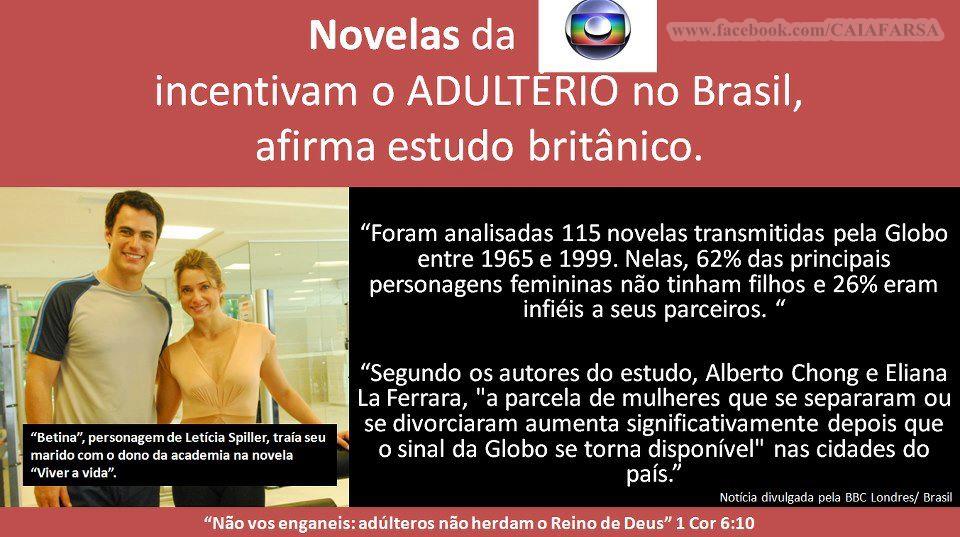 Foram analisadas 115 novelas transmitidas pela Globo entre 1965 e 1999. Nelas, 62% das principais personagens femininas não tinham filhos e 26% eram infiéis a seus parceiros.
