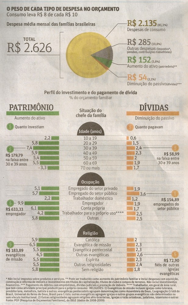 Na avaliação por religião, as famílias em que a pessoa de referência era espírita, a despesa média total era de R$ 4.821,66 em 2008-2009, mais que o dobro das famílias com pessoa de referência evangélica pentecostal (R$ 2.035,01). Entre os católicos, a despesa média ficou em R$ 2.602,42.