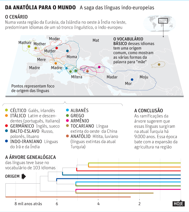 Os pesquisadores usaram a mesma abordagem para montar a árvore genealógica dos idiomas indo-europeus. Em vez de procurar por semelhanças no DNA, buscaram por palavras cognatas em 103 idiomas da família, desde os mais modernos aos já extintos. Depois de montar a árvore genealógica e de traçar como cada língua se espalhou pela Europa e Ásia, eles estimaram onde cada uma delas havia surgido, chegando até o idioma original.