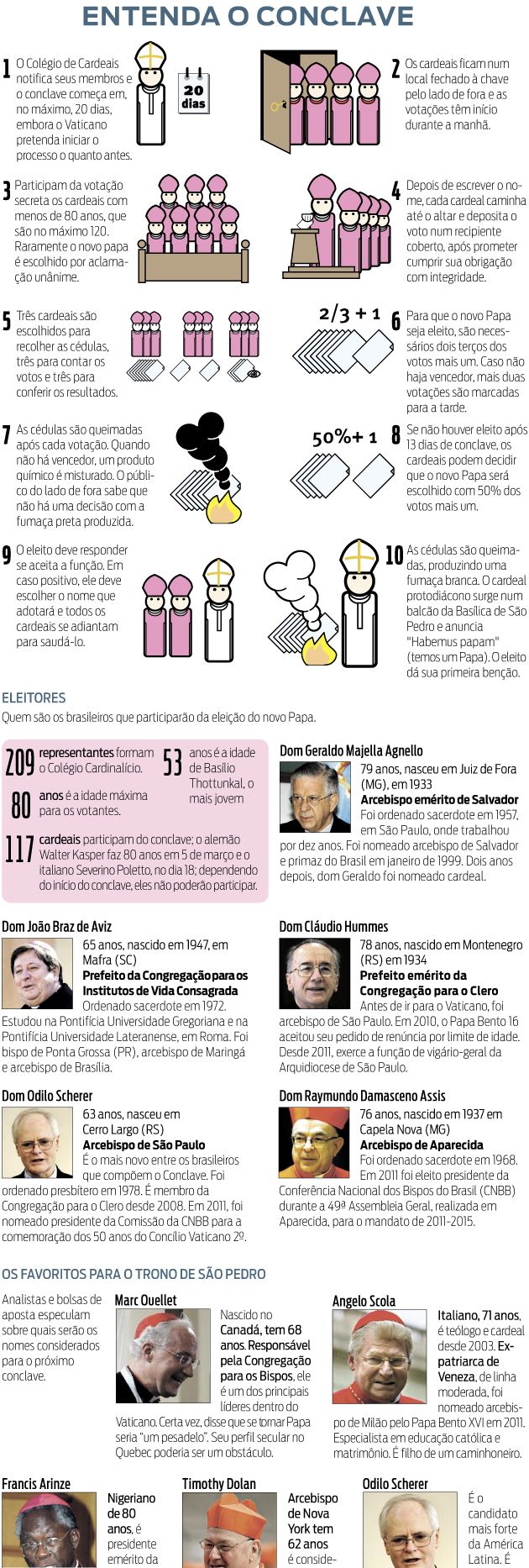 Tudo o que se pode esperar da escolha do sucessor de Bento XVI é o fim de um Vaticano eurocêntrico. Desde que Karol Wojtyla tornou-se João Paulo II, a Europa é o centro das atenções da Cúria. O Papa polonês cumpriu uma fenomenal missão histórica ajudando a desmontar décadas de tolerância com as ditaduras comunistas. Seu sucessor teve um pontificado medíocre enrolado pela tolerância com escândalos sexuais e financeiros de sacerdotes. Um deles passou de raspão pelo Brasil, num trambique do namorado da atriz Anne Hathaway, sócio do sobrinho do atual decano do Colégio de Cardeais, o poderoso ex-secretário de Estado Angelo Sodano. A moça micou em US$ 135 mil e o rapaz foi preso nos Estados Unidos.