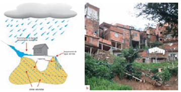 Lídia Keiko Tominaga, em artigo que analisa o processo de ocupação no Maciço da Tijuca (RJ), verificaram que cerca de 50% dos 242 escorregamentos existentes no maciço ocorreram em favelas, que cobrem somente 4,6% da área total do maciço. Os autores explicam que esta elevada frequência de escorregamentos está intimamente relacionada ao aumento de intervenções com cortes para a construção de moradias precárias em encostas íngremes situadas no sopé de afloramentos rochosos.