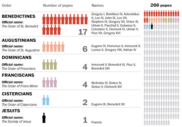 Dos 266 Papas eleitos, apenas 34 vieram de Ordens religiosas. É a primeira vez que um jesuíta é eleito. A restauração da Companhia de Jesus ocorreu em 7 de agosto de 1814, pelo então Papa Pio VII.