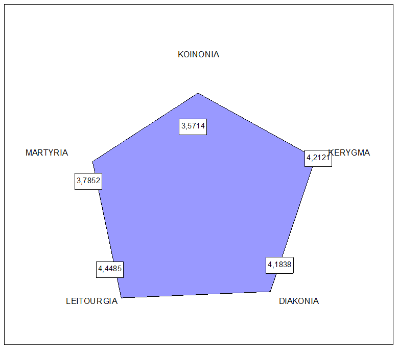 - A dimensão KOINONIA apresentou o menor valor. Talvez o grande porte da igreja e a falta de reuniões em grupos pequenos influenciem, embora, os grandes grupos forneçam comunhão.