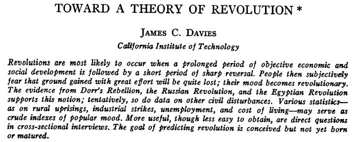 Davies, James C. (1962) “Toward a Theory of Revolution” American Sociological Review, 27(1): 5–19.