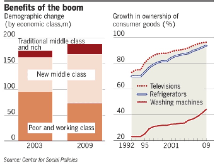 Estima-se que, entre 2003 e 2011, 40 milhões de brasileiros ingressaram na classe média (cerca da população total da Argentina). Ele argumenta que a combinação de programas sociais de transferência de renda e uma melhor inserção no mercado de trabalho dos brasileiros, com o aumento do emprego formal e dos salários são responsáveis pelo crescimento da renda média per capita, o que sugere que a classe média brasileira cresce de forma sustentada.