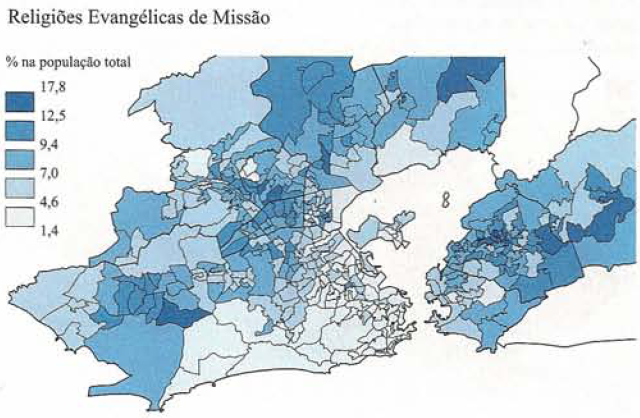 Os pesquisadores José Eustáquio Diniz Alves e Luiz Felipe Walter Barros, responsáveis pelo estudo ‘A transição religiosa brasileira e o processo de difusão das filiações evangélicas no Rio de Janeiro’, constataram que, nos últimos anos, as periferias da Região Metropolitana do Rio promoveram o avanço dos evangélicos em direção ao interior. Em 2000, dos 92 municípios fluminenses, os evangélicos eram mais numerosos apenas em Silva Jardim, na Baixada Litorânea. Dez anos depois, os evangélicos passaram a ser maioria em 18 cidades do estado do Rio.