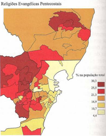 Os pentecostais representavam, respectivamente na capital e demais municípios, 11,3 % e 17,1 % da população total, ou seja, mais do que o dobro dos protestantes tradicionais. Entre 1991 e 2000, oservou-se que o aumento dos pentecostais se mostrou mais acentuado na periferia, +6,4 pontos percentuais, do que na capital, +4,7 pontos. Enquanto a Assembléia de Deus se mostra mais presente na periferia, a IURD se destaca no município da capital e na sua periferia mais próxima.