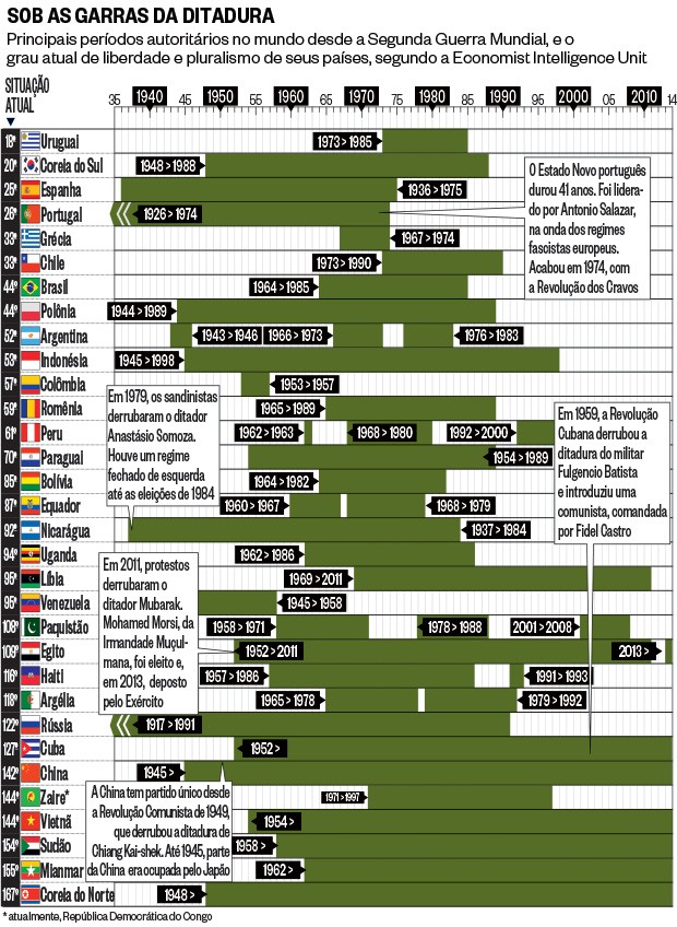 Um índice elaborado pela revista britânica The Economist mostra que menos da metade da população mundial vive em algum tipo de democracia. Apenas 11% (25 países) vivem numa “democracia completa”. O levantamento baseia-se em 60 indicadores, como processo eleitoral e pluralismo, liberdades civis, funcionamento do governo, participação política e cultura política. O índice mostra que a liberdade mundial caiu pelo oitavo ano consecutivo, por causa do crescimento do controle estatal, censura e formas de autoritarismo.