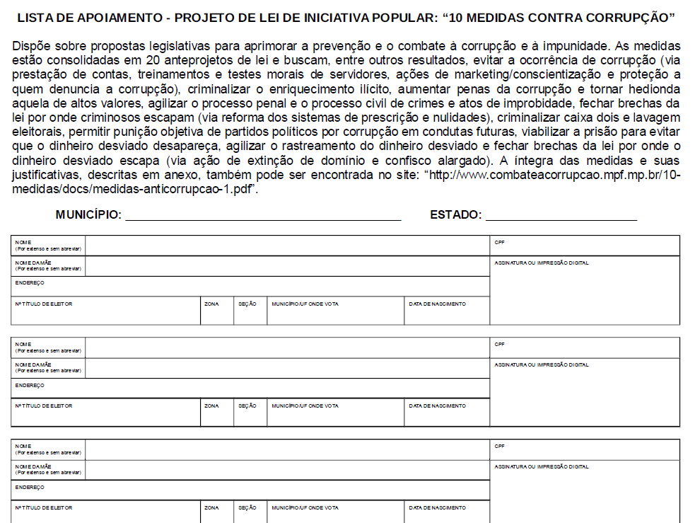 O Ministério Público Federal (MPF) começou a colher, em todo o Brasil, assinaturas de cidadãos que apoiam dez medidas para aprimorar a prevenção e o combate à corrupção e à impunidade. As propostas de alterações legislativas buscam evitar o desvio de recursos públicos e garantir mais transparência, celeridade e eficiência ao trabalho do Ministério Público brasileiro com reflexo no Poder Judiciário. A íntegra das medidas e a ficha de assinatura estão disponíveis no site www.10medidas.mpf.mp.br.