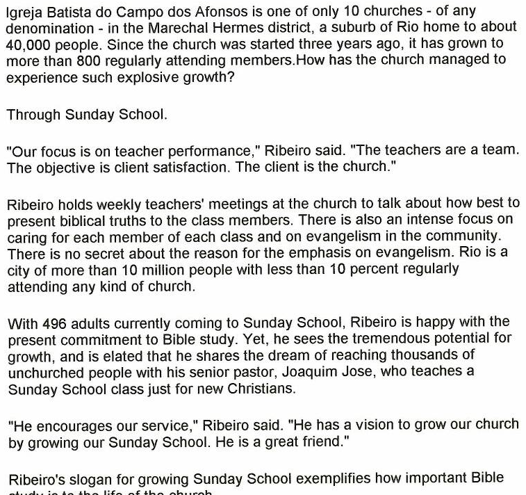 Em Maio de 2000, a LifeWay publicou a história de desenvolvimento da Escola Bíblica de nossa igreja batista do Campo dos Afonsos. Convém acrescentar que a IBCA cresceu, no período de 1997 a 2000, de 860 a 1140 membros. No mesmo período, a Escola Bíblica passou de 336 a 515 alunos matriculados com frequência média de 65%.