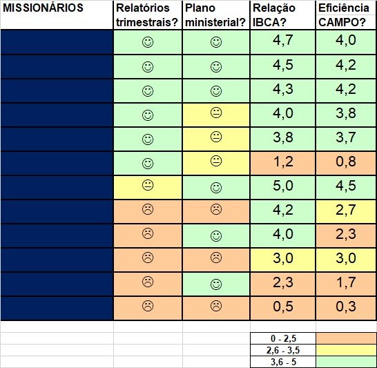 Em uma planilha, elaboramos um sistema de pontuação que incluía a recepção de relatórios trimestrais e plano ministerial atualizado bem como da percepção de diversos líderes da igreja sobre relação do missionário com a igreja e sua atividade no campo.